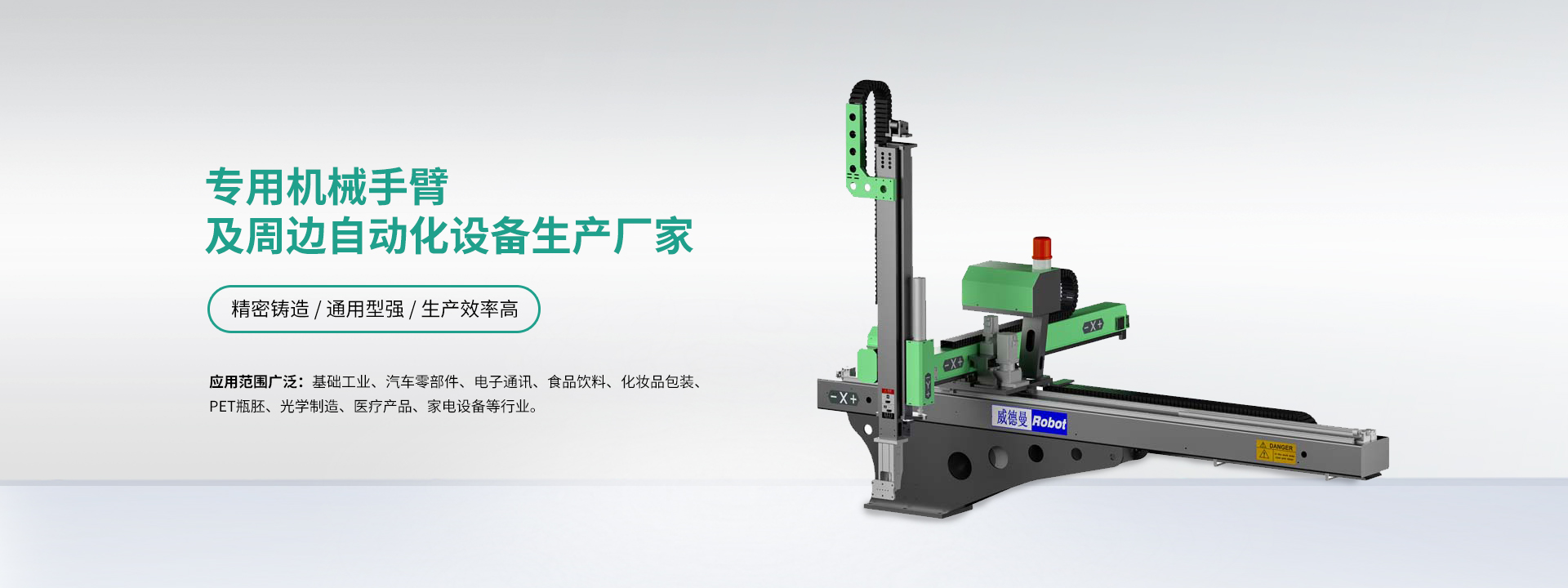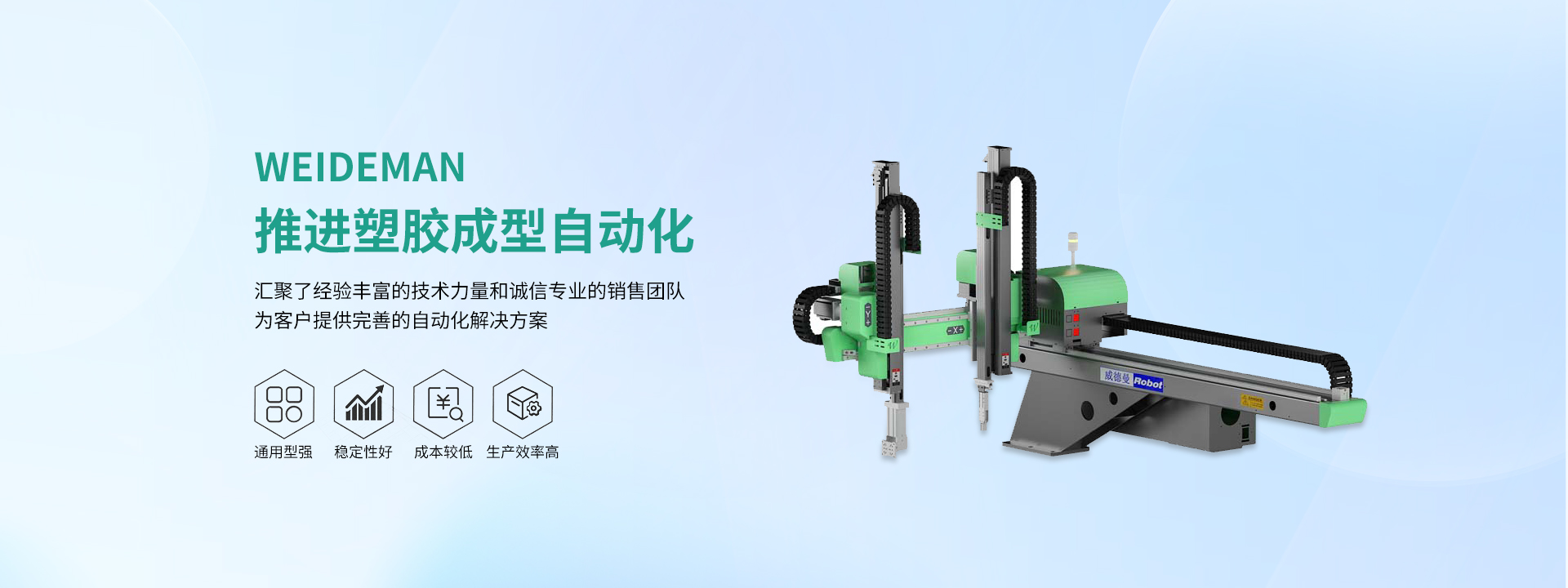 扬州威德曼自动化科技有限公司成立于2010年,主要研发、生产、销售射出成型机之专用机械手臂及周边自动化设备,产品广泛适用于基础工业、汽车零部件、电子通讯、食品饮料、化妆品包装、PET瓶胚、光学制造、医疗产品、家电设备等行业。 威德曼坚持“推进塑胶成型自动化”的企业使命,公司汇聚了经验丰富的技术力量和诚信专业的销售团队,以客户需求为导向,为客户提供 完善的自动化解决方案。